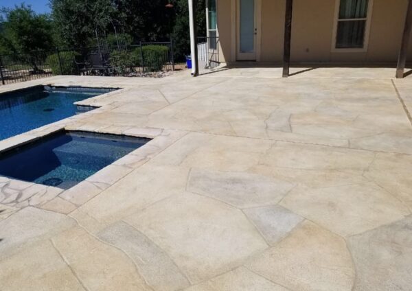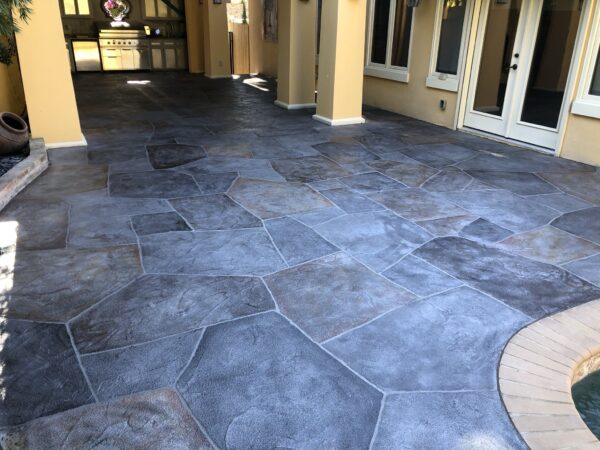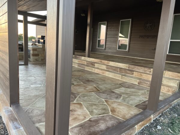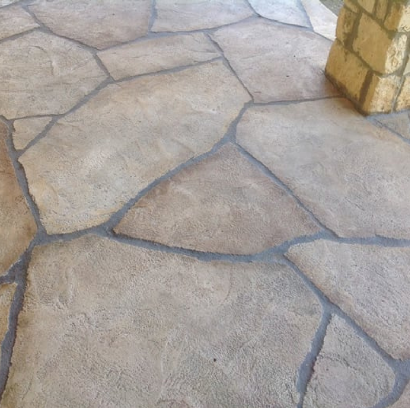 Instead of quarried stone, our team applies a durable overlay directly onto your existing concrete. From there, we shape and carve it to achieve the irregular lines and organic feel of real flagstone. Every detail, from the texture to the grout lines to the color blends, is tailored to your style. Whether you love the warm earth tones of Oklahoma flagstone, the silvery hues of slate, the bright whites of Austin stone, or the rich reds of Colorado rock, we can recreate the look you want without the high cost or ongoing maintenance of natural stone.”
